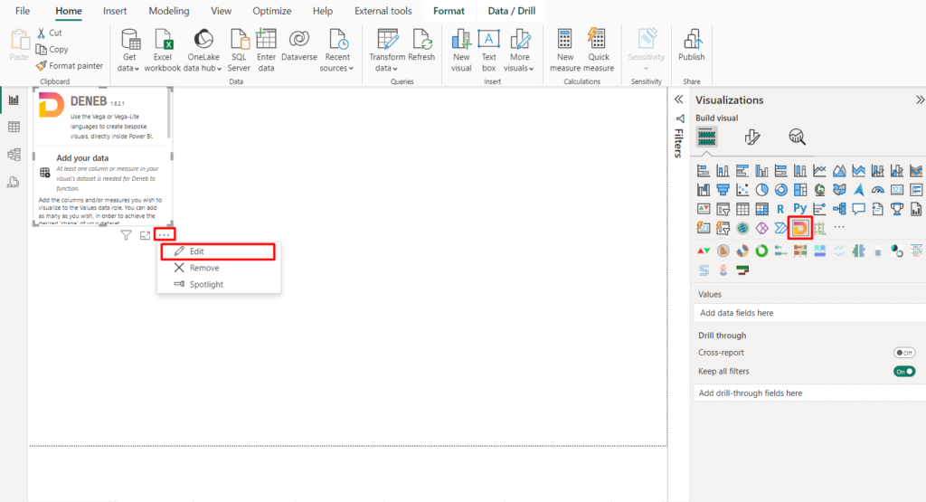 Click vào visual deneb vừa được tạo ra ở màn hình, chọn dấu “…” và Edit.