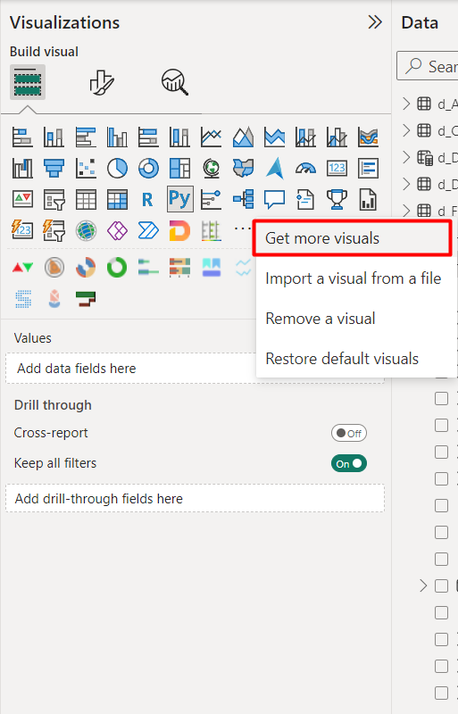 Trước hết, ở khung Visualization, bạn nhấp chuột vào dấu “…”, chọn Get more visuals.